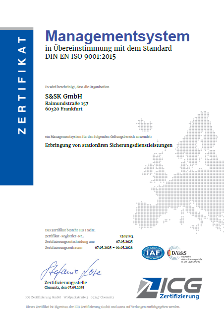 Unsere Fachkräfte sind umfassend geschult, regelmäßig weitergebildet und nach den höchsten Standards zertifiziert – darunter ISO 9001 und DIN 77200-1 für Sicherheitsdienstleistungen.